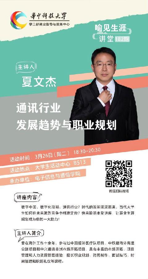 (通訊員:魏琴、馬郢雪)3月26日晚,第182期“喻見生涯”講座于大學生活動中心B513順利舉辦。本次講座邀請了中興通訊華中區人力資源經理夏文杰,以“通訊行業發展趨勢與職業規劃”為主題,向廣大同學介紹企業求職技巧并解析崗位職責。活動由學工部就業指導與服務中心舉辦、電子信息與通信學院承辦,就業中心周丹、甘圓圓以及全校百余名學生共同參與。