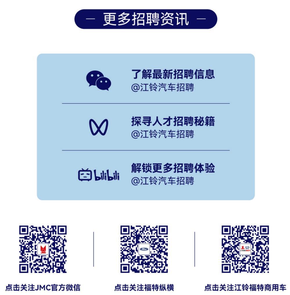 更多崗位及專業要求可登陸江鈴汽車校招官網及關注江鈴汽車招聘微信公眾號。