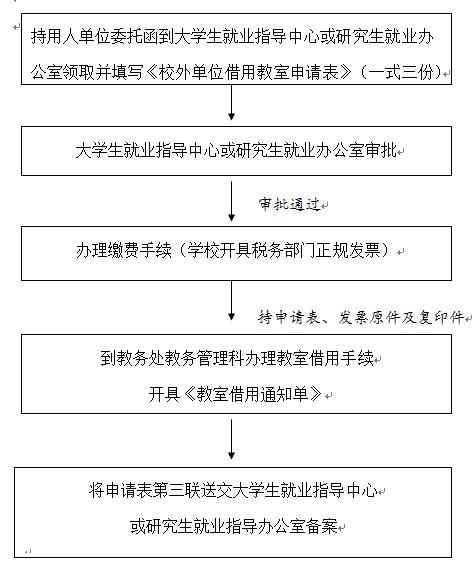 為保證校園招聘活動和學校教學工作正常進行,根據學校教務處《關于單位借用教室的管理規定》(校教〔2007〕52號),就用人單位借用學校教學樓教室開展與畢業生招聘相關活動,規定如下: